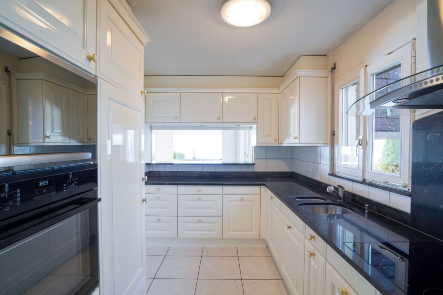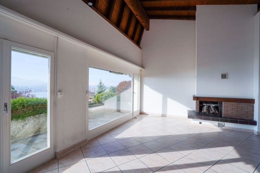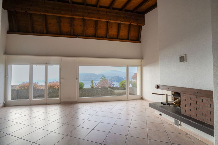 Im schön offenen Wohnraum profitieren Sie von Deckenhöhen bis knapp 5m und einem Cheminée, was ein besonders spannendes Wohngefühl ermöglicht. Von hier haben Sie direkten Zugang zur Terrasse mit wunderbarem See- und Bergblick. Die Südlage sorgt für besonders viele Sonnenstunde und lässt Sie bis zum letzten Sonnenstrahl die Idylle und Magie dieses Wohnortes geniessen.