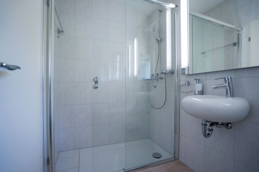 Die Wohnung profitiert von zwei Schlafzimmern mit Zugang zur weitläufigen Terrasse. Der Master-Bedroom verfügt über eine direkte Verbindung zum Badezimmer mit Badewanne, Dusche und Doppellavabo. In diesem Zimmer ist die Deckenhöhe ebenfalls sehr eindrücklich. Ein weiteres Zimmer, ein mögliches Büro, hat direkten Zugang zum nördlich ausgelegten Garten, in dem Sie auf 65m2 gemütlich zu jeder Tageszeit sitzen können.