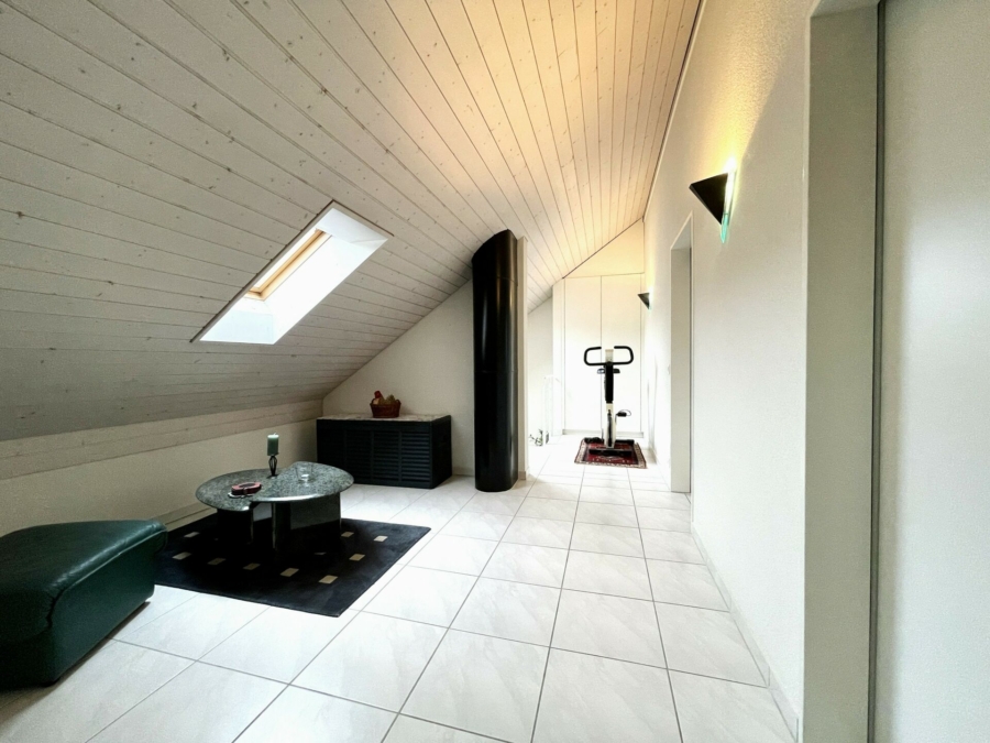 Die zwei weiteren Schlafzimmer im 2. Obergeschoss geniessen dank der Dachschrägen ein besonderes Ambiente. Eine weitere Nasszelle mit Dusche sowie ein einladend gestalteter Flur runden das Dachgeschoss ab.