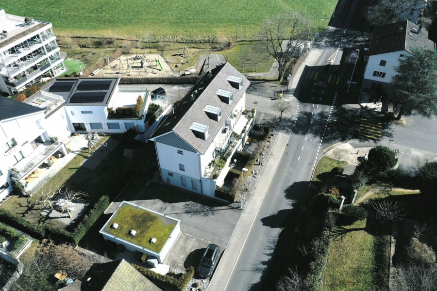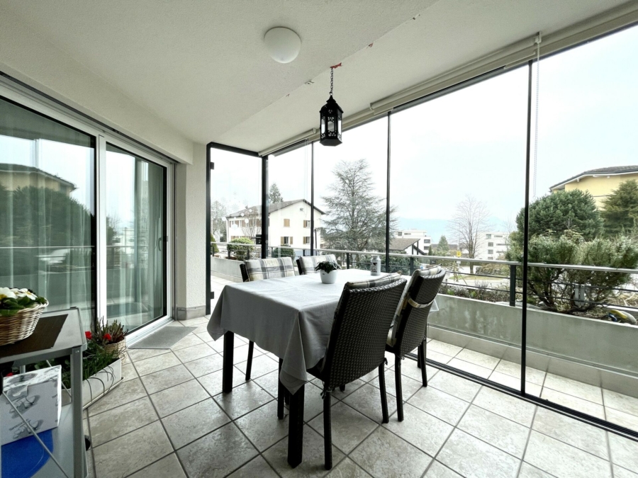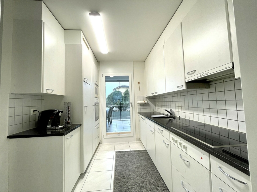 Im Erdgeschoss befindet sich der Wohn- und Essbereich mit separater Küche, welche sich mit einer Schiebetür öffnen lässt. An die Küche grenzt ein separates Reduit mit praktischem Schrank und einem Waschturm. Von beiden Wohnbereichen haben Sie Zugang zum Wintergarten mit angrenzendem Balkon und teilweise Seesicht.
